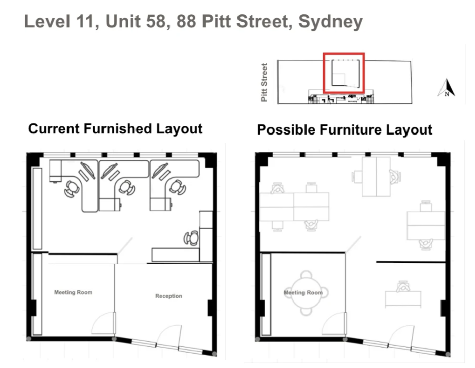 88 Pitt Street is superbly located in the heart of Sydney’s Central Business District. It is a short walking distance to George Street, MLC Centre, Australia Square, Chifley Tower and Barangaroo. Wynyard and Martin Place Train Stations are close by. Circular Quay ferry terminal is located only minutes to the north. - Fitted and furnished suite - Reception, meeting room and open plan area with 4 work stations - Wet kitchenette and shower on the same floor - Internal A/C control and direct lift exposure - Access to Rooftop terrace